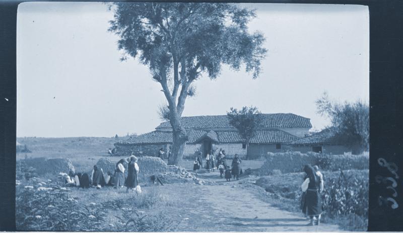 Στην εικόνα εμφανίζονται μανάδες που έχουν κοντά τα μικρότερα παιδιά τους επειδή ενδεχομένως δεν έχουν που να τα αφήσουν. Εστιάζοντας στην στάση των γυναικών καταλαβαίνουμε πως η συγκεκριμένη φωτογραφία πιθανόν να μην είναι σκηνοθετημένη. Το σημείο λήψης τοποθετείται μπροστά από ένα τεράστιο λιτό πέτρινο σπίτι ενώ κολλημένο σ’ αυτό υπάρχει ένα άλλο λίγο χαμηλότερο. Γύρω τους υπάρχει μια μισογκρεμισμένη μάντρα σε δυο σημεία, στο ένα σημείο είναι εντελώς κατεστραμμένη και έχει δημιουργηθεί ένας χωματόδρομος. Ακόμη, υπάρχουν δέντρα και συγκεκριμένα στη μέση της εικόνας δίπλα στον μαντρότοιχο δεσπόζει ένα πανύψηλο φουντωτό δέντρο, το οποίο δημιουργεί πυκνή σκιά. Αν κοιτάξουμε στο βάθος πλάι στο σπίτι φαίνεται ένας γυμνός λόφος με λίγα δέντρα στην κορυφή. Στα αριστερά και στα δεξιά της εικόνα διαφαίνονται ορισμένα αγριολούλουδα. Οι περισσότερες γυναίκες που διακρίνουμε στην φωτογραφία μάλλον είναι μανάδες διότι κρατούν είτε στην αγκαλιά τους είτε από το χέρι παιδιά. Ενδεχομένως να τα έχουν μαζί τους καθώς δεν υπάρχει κάποιο πρόσωπο να τα κρατήσει. Άλλες παρουσιάζονται να κρατούν σταμνιά με νερό. Κάποιες στέκονται καθιστές σε κύκλο ενώ ορισμένες τις «πιάνει» ο φακός την ώρα που σηκώνονται από τον κύκλο και ίσως θέλουν να συνεχίσουν την εργασία τους. Μερικές γυναίκες που βρίσκονται στο πλάι του σπιτιού. Στη συγκεκριμένη φωτογραφία εμφανίζεται μόνο ένας άνδρας ο οποίος φορά καπέλο και έχει τα χέρια του τοποθετημένα στη μέση. Ο συγκεκριμένος φαίνεται αυστηρός και επικριτικός σαν να κάνει παρατήρηση σε δυο γυναίκες, οι οποίες έχουν σκύψει τα κεφάλια τους προς τα κάτω.