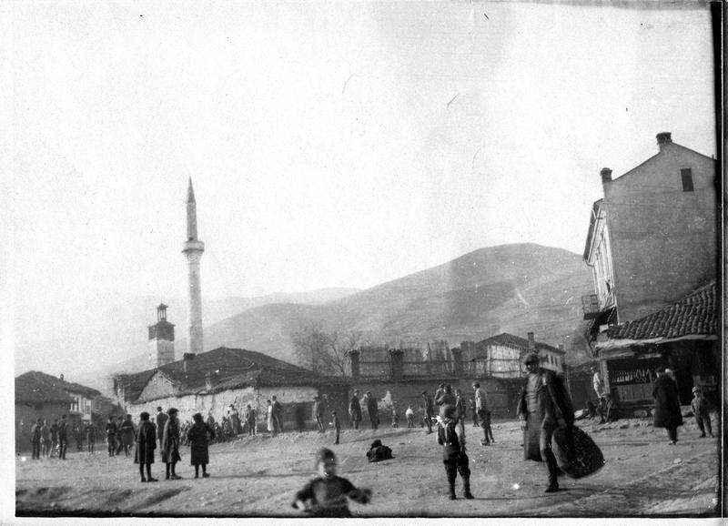 Η φωτογραφία φαίνεται να μην είναι σκηνοθετημένη, καθώς δεν είναι στημένη αλλά ο φωτογράφος έχει αποτυπώσει μια αυθόρμητη καθημερινή σκηνή. Ο φωτογράφος στέκεται στην άκρη της πλατείας, νότια και η λήψη κοιτάει προς τα βόρεια (στο φόντο το βουνό). Παρατηρούμε ένα δομημένο περιβάλλον. Στη φωτογραφία τα μόνα στοιχεία του φυσικού περιβάλλοντος είναι το βουνό στο βάθος και κάποια δέντρα χωρίς φύλλα, σημάδι που δείχνει πως η εποχή είναι χειμώνας ή τέλος φθινοπώρου. Βλέπουμε ανθρώπους χοντρά ντυμένους και μικρά παιδιά να στέκονται όρθιοι στην πλατεία και κυρίως περιμετρικά αυτής και ένα μικρό παιδί μόνο φαίνεται να τρέχει προς το μέρος που βρίσκεται ο φωτογράφος, γι'αυτό και βγήκε κουνημένο. Όλοι οι άνθρωποι είναι σε σχετικά μεγάλη απόσταση από το φωτογράφο, γι'αυτό και δεν μπορούμε να διακρίνουμε πρόσωπα. Υπάρχουν κάποια σπίτια με κεραμίδια , ένας τοίχος κι ένας μιναρές, σημάδι της παρουσίας των Οθωμανών στην περιοχή. Από αυτό που γράφει και στη λεζάντα, έχουμε τη διεξαγωγή ποδοσφαιρικού αγώνα, αν και δεν φαίνονται δίχτυα ή μπάλα στη φωτογραφία, οπότε το περιστατικό το καταλαβαίνουμε μόνο από τη λεζάντα