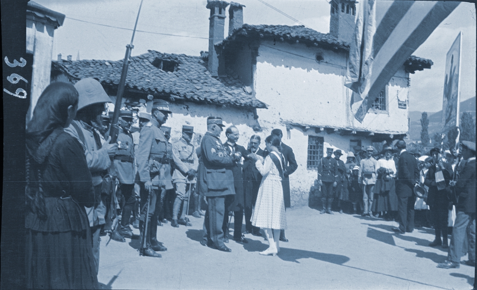 Το στιγμιότυπο προέρχεται από τη φωτογράφιση επίσημης εκδήλωσης , στην οποία παρίστανται πολιτικές προσωπικότητες με συνοδεία στρατού . Ανώτεροι αξιωματικοί και άνδρες του στρατού συνοδεύουν πολιτικούς , τους οποίους υποδέχεται η τοπική κοινωνία , μέσω μιας νεαρής γυναίκας εκπροσώπου της , η οποία τους καλωσορίζει με κάποια λόγια που εκφωνεί . Είναι ντυμένη με ωραίο , κομψό ανοιχτόχρωμο πουά φόρεμα , χοντρές άσπρες κάλτσες και λευκά υποδήματα . Από την έκφραση των τριών ανδρών που βρίσκονται απέναντι της υποθέτουμε ότι ευαρεστήθηκαν με την υποδοχή . Οι τρεις είναι καλοντυμένοι με ευρωπαϊκά ρούχα της εποχής , λευκά πουκάμισα , γραβάτες και ημίπαλτα , ενώ ο επιβλητικός στρατιωτικός διακρίνεται ιδιαίτερα για τα παράσημα που φέρει στο στήθος του . Πολεμικό όπλο με ξιφολόγχη κρατά ένας στρατιώτης, ενώ δίπλα του, από τη μια πλευρά στέκεται μια μελαχρινή μαυροντυμένη γυναίκα, με μαντήλα και μακριές κοτσίδες , και από την άλλη είναι παρατεταγμένοι στρατιωτικοί . Δεξιά στη φωτογραφία απεικονίζονται πολίτες, άνδρες , γυναίκες και παιδιά , καλοντυμένοι , ειδικά η κυρία με το μοντέρνο για την εποχή καπέλο , καθώς και οι δύο στρατιωτικοί που επιβλέπουν την τάξη . Δύο έφηβοι κρατούν το γαλλικό λάβαρο με τη μορφή του κόκορα και η ελληνική σημαία αγέρωχη διεισδύει στο φόντο . Η όλη σκηνή εκτυλίσσεται μπροστά στα παλιά σπίτια με κεραμοσκεπές , ενώ στο βάθος διακρίνονται δέντρα και βουνά .