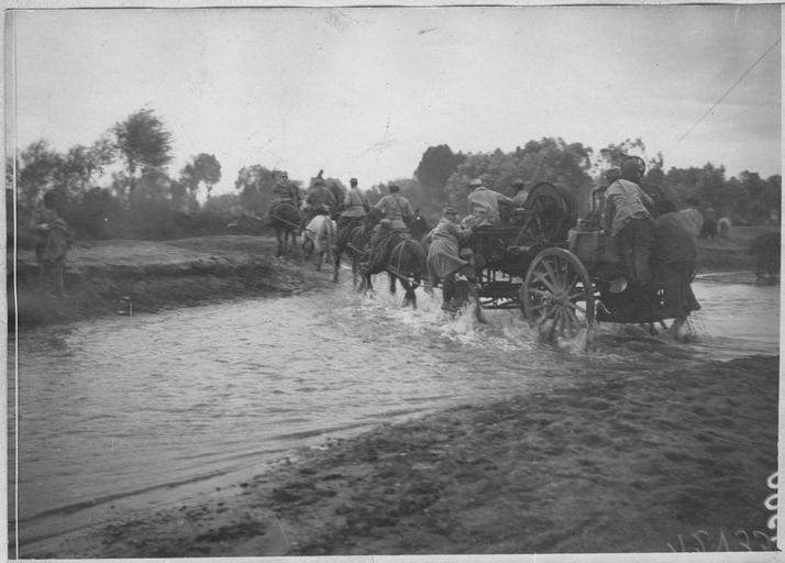 Κεντρικό θέμα της φωτογραφίας είναι η μεταφορά με κάρο, στρατιωτικού εξοπλισμού (βαρούλκο αερόστατου), από το χωριό Μαρίνα (όπου υπήρχε στρατιωτική βάση) προς το Μοναστήρι, διασχίζοντας τον ποταμό Σακουλέβα.