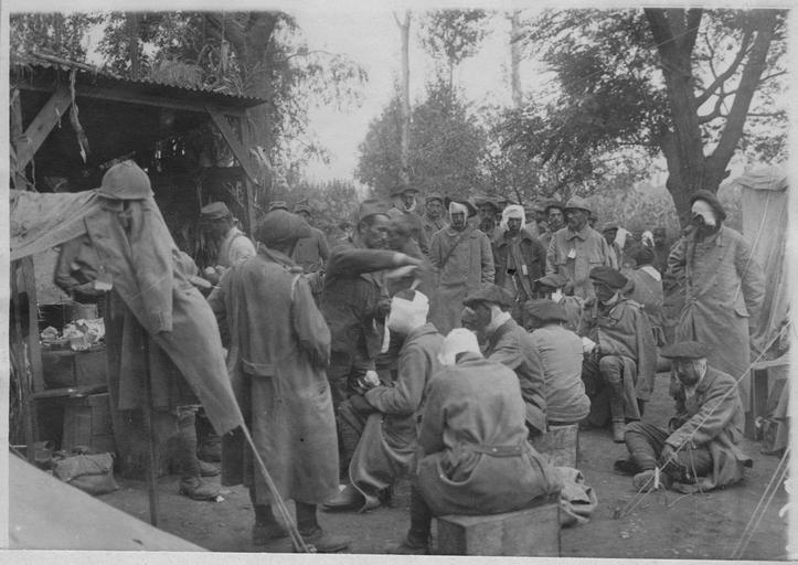 Στην φωτογραφία διακρίνουμε στρατιώτες (26-27 στον αριθμό). Οι περισσότεροι από αυτούς είναι τραυματισμένοι και χρειάζονται ιατρική περίθαλψη. Στο κέντρο της φωτογραφίας διακρίνουμε έναν άνδρα να τυλίγει με επίδεσμο το κεφάλι ενός πληγωμένου στρατιώτη. Ο άνδρας αυτός ενδεχομένως να είναι γιατρός.Βέβαια η ενδυμασία του είναι ίδια με αυτή των στρατιωτών. Οπότε μάλλον, είναι και αυτός στρατιώτης που περιθάλπει τους πληγωμένους συστρατιώτες του. Ο αυθορμητισμός της κίνησης του χεριού του καθώς διπλώνει τον επίδεσμο στο κεφάλι του τραυματία, καθώς και η προσήλωση του βλέμματός του στην περίθαλψη του ασθενή - και όχι στην κάμερα- προδίδουν, ότι η φωτογραφία δεν είναι σκηνοθετημένη. Επίσης, κανείς δεν κοιτάζει προς την κάμερα, ενώ κάποιοι κάθονται πλάτη προς αυτήν. Στο πίσω μέρος της φωτογραφίας, έχει δημιουργηθεί μια ουρά από στρατιώτες που αναμένουν να δεχθούν περίθαλψη. Κάποιοι στρατιώτες έχουν δεχτεί ήδη. Τυλιγμένοι με επιδέσμους γύρω από το πρόσωπο, τον λαιμό και στο κεφάλι διακρίνονται κυρίως στα δεξιά της φωτογραφίας. Όλοι τους είναι εξαντλημένοι. Κάποιοι κάθονται στο χώμα, σε ξύλα ή πάνω σε μπαούλα. Τα πρόσωπα όλων προδίδουν την εξάντλησή τους, φανερώνουν λύπη και πόνο. Κανείς τους δεν χαμογελάει. Οι στρατιώτες φορούν μακριές καμπαρντίνες, παντελόνια και υφασμάτινα καπέλα. Μόνο όσοι έχουν δεμένο το κεφάλι τους δεν φοράνε καπέλα. Στα αριστερά της φωτογραφίας υπάρχουν κρεμασμένα ρούχα πάνω σε ένα σκοινί, κοντά στο υπόστεγο. Από ότι φαίνεται το υπόστεγο λειτουργεί ως αποθηκευτικός χώρος για τους επιδέσμους και για άλλα αντικείμενα πρώτων βοηθειών. Από την φωτογραφία απουσιάζουν τεχνουργήματα, ζώα, στοιχεία του φυσικού περιβάλλοντος. Βέβαια, υπάρχουν πολλά δέντρα με πλούσιο φύλλωμα. Στοιχείο που αποδεικνύει την ημερομηνία λήψης της φωτογραφίας (20/09/1916), καθώς τα φύλλα των δέντρων δεν έχουν πέσει ακόμη. Τέλος, σύμφωνα με την λεζάντα, οι τραυματίες επρόκειτο να αναχωρήσουν με το τρένο. Παρολα αυτα το τρένο δεν είναι ορατό στην φωτογραφία.
