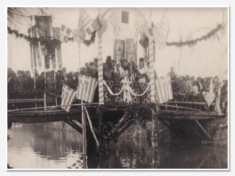 Στην εικόνα απεικονίζεται μια θρησκευτική τελετή που πιθανόν να είναι τα Θεοφάνια αυτό μπορούμε να το υποθέσουμε διότι βλέπουμε πλήθος κόσμου να στέκεται πάνω στην ξύλινη γέφυρα κρατώντας ελληνικές σημαίες ,εκκλησιάστηκα λάβαρα και εξαπτέρυγα. Χαρακτηρίστηκα βλέπουμε διακοσμήσεις και γιρλάντες κατά μήκος της γέφυρας καθώς και τρείς ιερείς στο κέντρο ,ο ένας από αυτούς φαίνεται από την ενδυμασία να είναι ο μητροπολίτης της πόλης. Από τις εκφράσεις του κόσμου μπορούμε να πούμε ότι πρόκειται για ένα ευχάριστο γεγονός όπως τα Θεοφάνια όπου ο ιερέας ρίχνει τον σταυρό στα ύδατα και οι πιστοί προσπαθούν να τον βρουν. Τέλος στο βάθος μπορούμε να διακρίνουμε ένα ψηλό κτίριο που πιθανόν να είναι καμπαναριό. Ο φωτογράφος φαίνεται να αποτυπώνει την εικόνα από την αριστερή όχθη του ποταμού όπου μπορεί με ευκρίνεια και σταθερότητα να αποτυπώσει το γεγονός